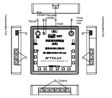 ①Reset button: Used to put the controller into the set state or reset the controller. Press the button within 1s, and the controller enters the setting state; Press and hold for more than 5S to reset the WIFI module. Long press for more than 10S, the controller restores the factory 2.4GHz Settings, all the remote controls codes are cleared, and the WiFi is reset.